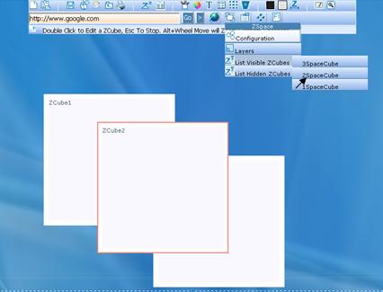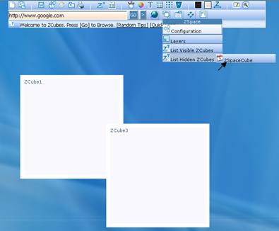 | 3. Select ZTools menu on the power bar and then select 'List Hidden ZCubes' to see a list of all hidden ZCubes. | 4. Select a particular ZCube from the list and it will be displayed in the ZSpace. |